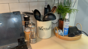 One of our biggest kitchen challenges was keeping utensils organized during travel days. Our old caddy would constantly fall over in cabinets, and we’d maxed out all our drawers. The solution? A magnetic utensil holder that sticks securely to any metal surface. This simple RV accessory has eliminated the frustration of utensils scattered all over the kitchen after a bumpy travel day.