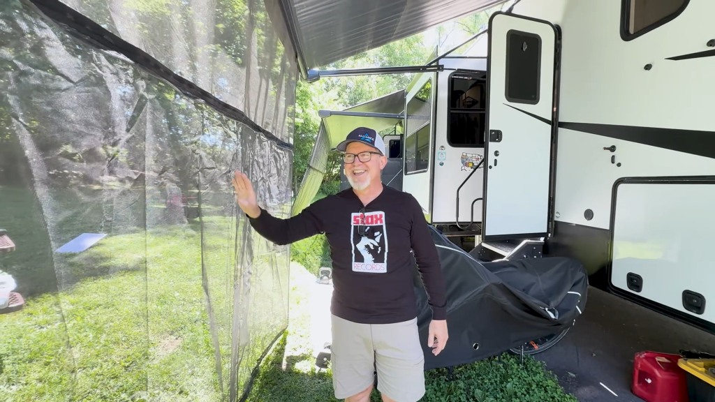This creates additional livable space and keeps that side of the RV cooler as the sun changes throughout the day. When we first used this in Arizona in July (our first mistake – don’t go to Arizona in July!), we couldn’t believe the difference it made.
